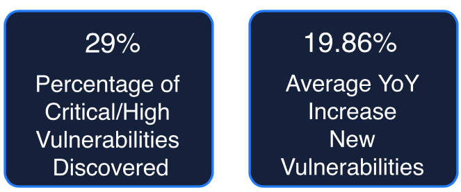 Let’s start by analyzing the magnitude of the problem. Year over year, the trend of vulnerability discovery has been on the rise — The statistic below shows that last year saw the highest number of new vulnerabilities discovered in a year. The vulnerability analysis indicates that 29% of the identified vulnerabilities are classified as either Critical or High and require action. Factoring in the thousands of assets in any environment, the challenges of vulnerability remediation are apparent. The size of the problem without an effective prioritization strategy is unmanageable at any scale.