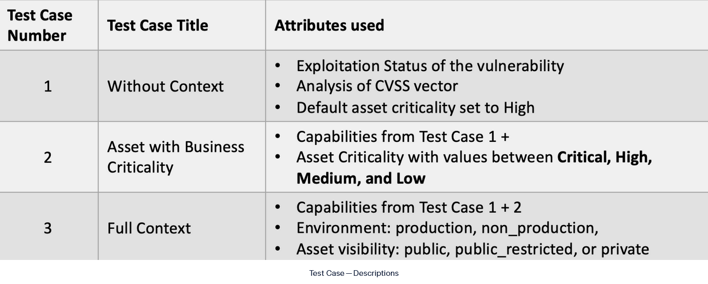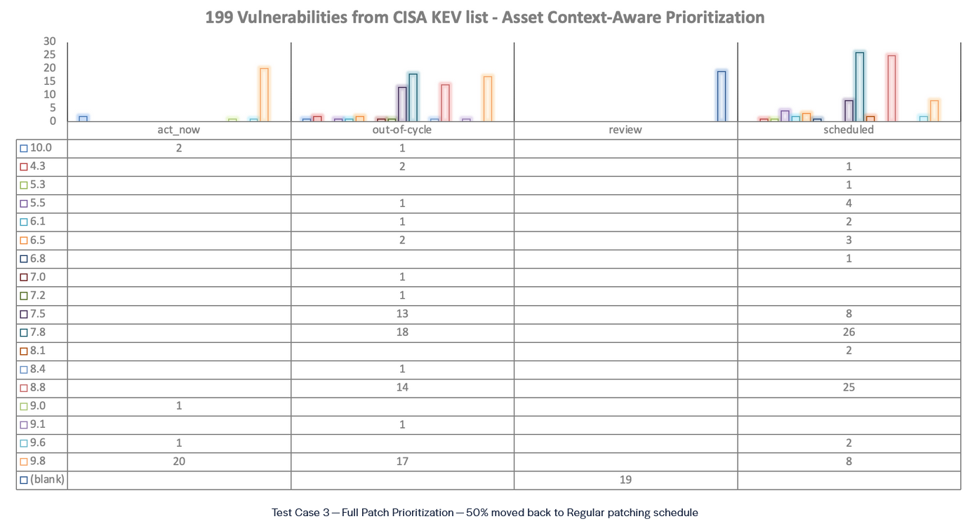To validate our findings, we tested for three test cases. First, we took 199 unique vulnerabilities from Cybersecurity and Infrastructure Security Agency(CISA) Known Exploited Vulnerability Catalog. CISA KEV is a popular method of prioritizing vulnerabilities. The hypothesis was to improve Threat Intelligence-driven patch prioritization and present the case that such prioritization can be significantly enhanced with asset context.